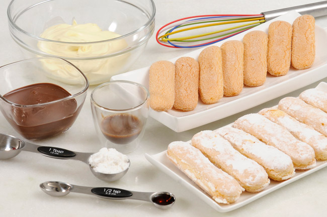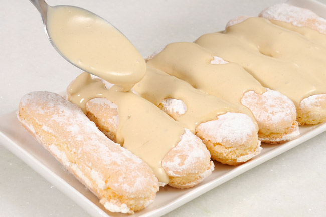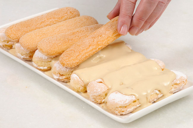 Coloque metade dos biscoitos ingleses numa travessa. Se quiser, borrife com conhaque ou rum (opcional). Coloque a mistura do creme de leite sobre os biscoitos.