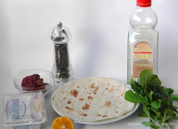 Esquente uma frigideira (sem óleo, sem nada). Coloque a tortilha e esquente de um lado e depois do outro, retire do fogo e coloque um fio de azeite de oliva extra vírgem na tortilha. Coloque o cream cheese em um recipiente e tempere com a pimenta do reino e o suco de limão (tempere a seu gosto). Coloque o cream cheese temperado na tortilha que deve estar quente e com o azeite. Arrume as folhas de rúcula e depois o tomate seco. Enrole a tortilha como um rocambole e depois corte ao meio. Sirva.